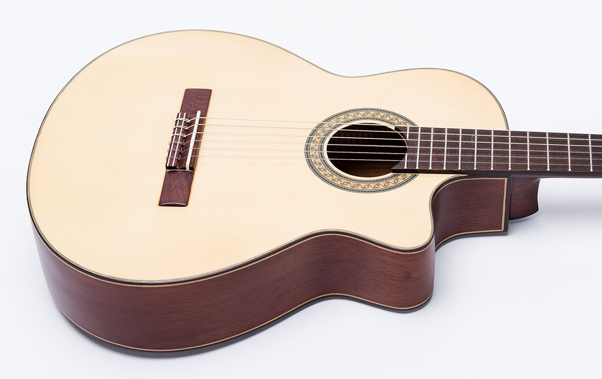 Mặt top làm từ gỗ thông nguyên tấm (solid spruce) cho âm thanh vang, sáng, rõ ràng và có độ ngân tốt.