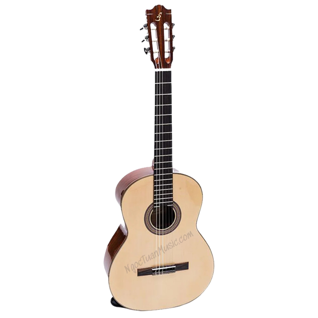 Mặt top làm từ gỗ thông nguyên tấm (solid spruce) cho âm thanh vang, sáng, rõ ràng và có độ ngân tốt.